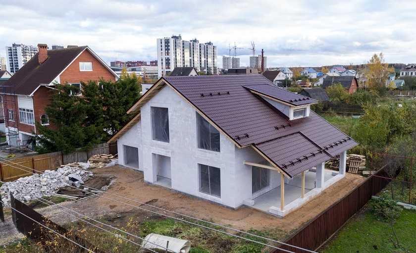 Монтаж кровельного материала нужно начинать снизу. Такое крепление листов позволяет стекать осадочной влаге, не попадая под кровельный настил. Строительство дома из газобетона занимает в среднем 6 месяцев. Длительность работ зависит от опыта, сложности проекта, уровня механизации.