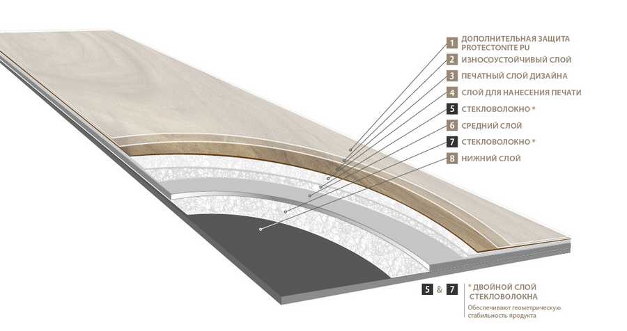 Чтобы кварц не высыпался, в структуру вводят один или два слоя стекловолокна — стабильность геометрических размеров кварцвиниловой плитки.