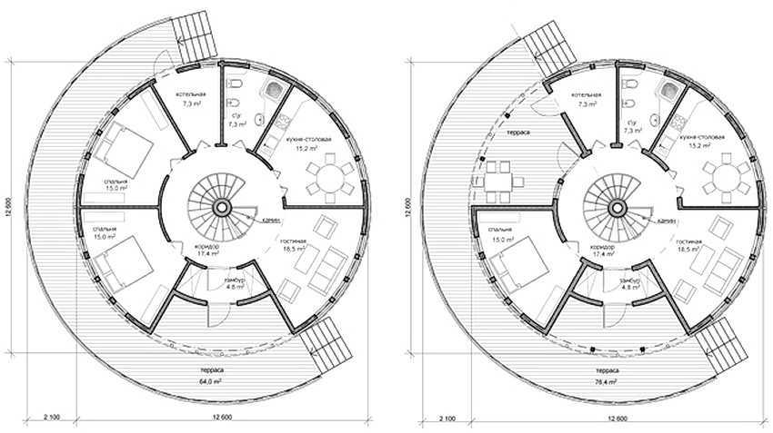 Чаще всего центральная часть пространства купольного дома выделяется под помещение общего пользования. Из этой центральной зоны можно попасть во все другие комнаты, которые расположены по кругу. Вообще, центральное помещение получается неудобным, так как оно «очень проходное».