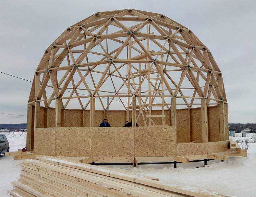 Коннекторный. Этот способ возведения купольных домов получил наибольшее распространение в Европе из-за простоты сборки. Для набора каркаса используются отрезки бруса, соединенные друг с другом через специальные коннекторы. Минусом этой технологи является наличие большого количества металла на стыках (мостиков холода), в результате чего падает энергоэффективность конструкции. Решается путем качественного утепления коннекторов.