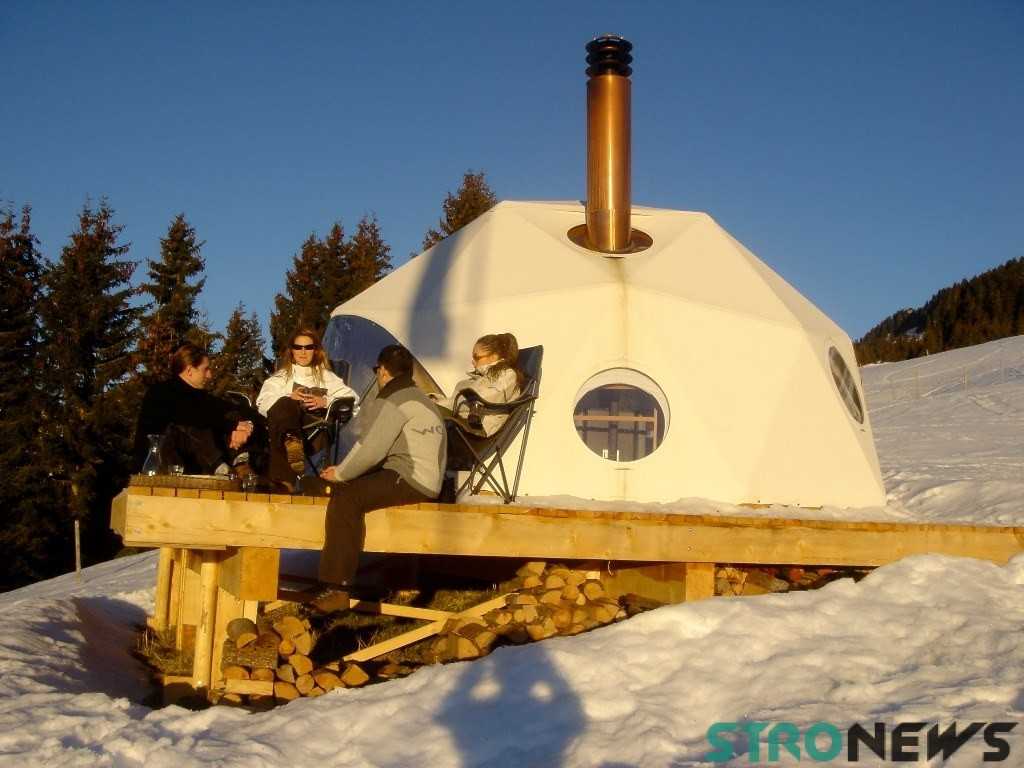 Каркасный натяжной купол — выполнен в виде каркаса из легкосплавных металлов, дерева или пластика, поверх которого натягивается водо- и термостойкий тент. Является временным сооружением. Неплохое применение нашел в исследовательских экспедициях, даже на Аляске.