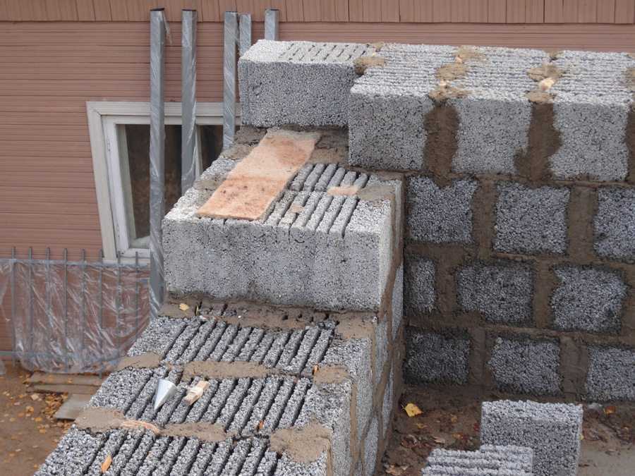 При строительстве из шлако- или керамзитоблоков действия немного иные. Тут не используют армопояс, а просто верхний ряд выкладывают отверстиями вверх. Впоследствии эти пустоты заполняют щебнем или же бетоном. Таким образом получается усиленная забетонированная конструкция.