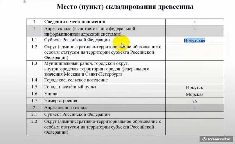 Образец заполнения места складирования древесины в ЕГАИС Лес