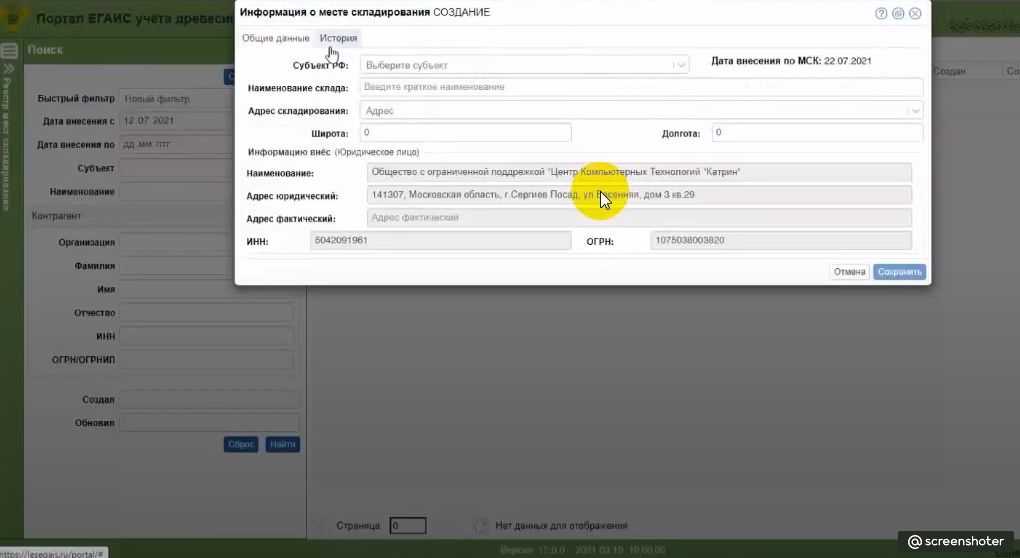 После заполнения адреса и координат мы увидим сведения об организации, которая внесла данные о складе в ЕГАИС. Когда мы сохранили результат, попадаем в поле списка всех Мест Складирования Древесины. Однако, информация о МСД будет находиться в статусе “Не подтверждена” до тех пор, пока данное место складирования мы не подпишем электронной подписью.