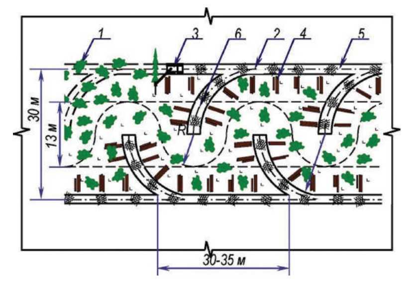 Рис. 7. Схема работы харвестера с заездами на полупасеки: 1 — растущий лес; 2 — волок; 3 — харвестер; 4 — пакет сортиментов; 5 — порубочные остатки; 6 — заезд на полупасеку