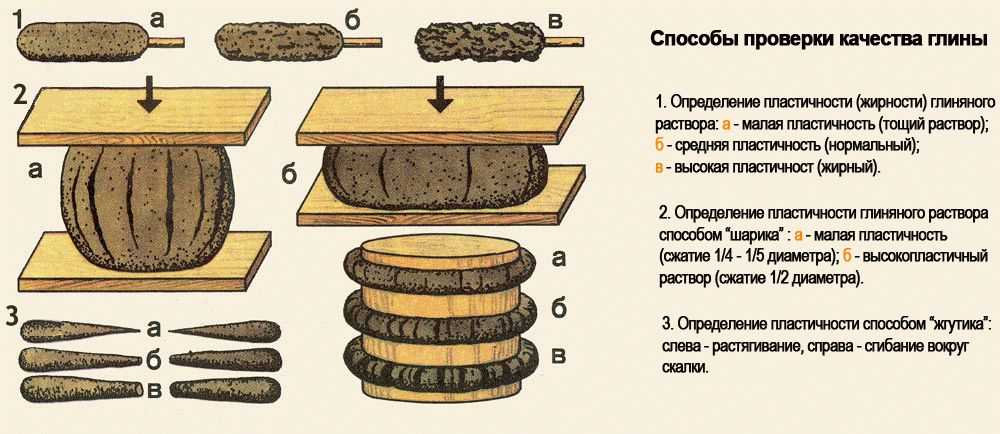 Можно провести тестирование на жирность и пластичность и по-иному. Скатайте шарики диаметром около 3 см, каждый разместите между двумя тщательно оструганными досочками. Аккуратно, плавно надавите на верхнюю из них, проверьте состояние шарика. Если он сразу растрескался, составу не хватает жирности. Если трещинки произошли при половинном сжатии, смесь излишне жирная. При правильной пропорции компонентов большая часть образца сплющится, но не разрушится.