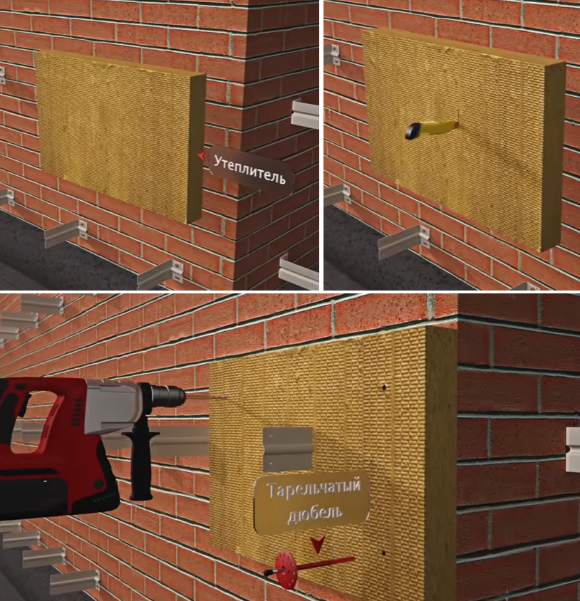Шаг 5. Сквозь плиты утеплителя просверливают отверстия в стене и осуществляют крепление с помощью пластиковых дюбель-гвоздей.