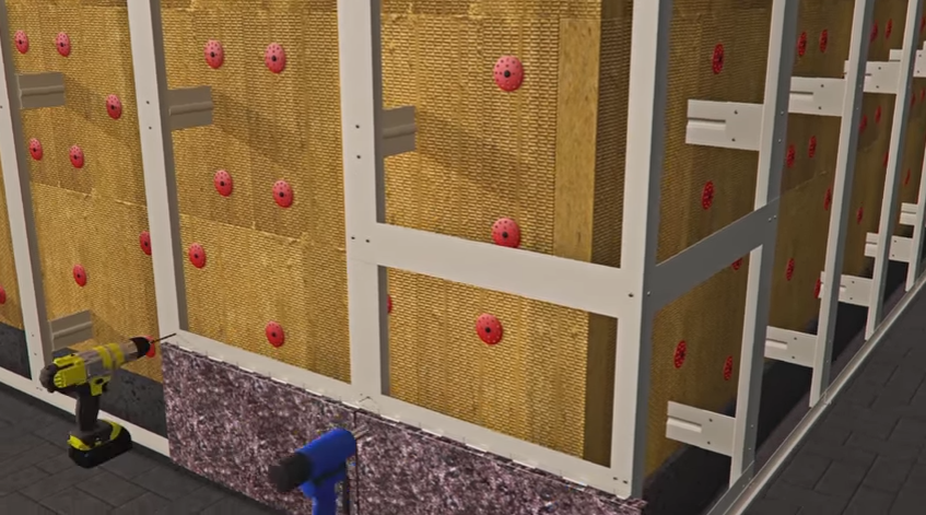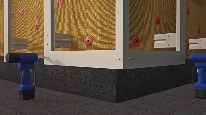 - Внизу монтируется стартовая рейка, по которой будет укладываться первый ряд и крепиться на саморезы.