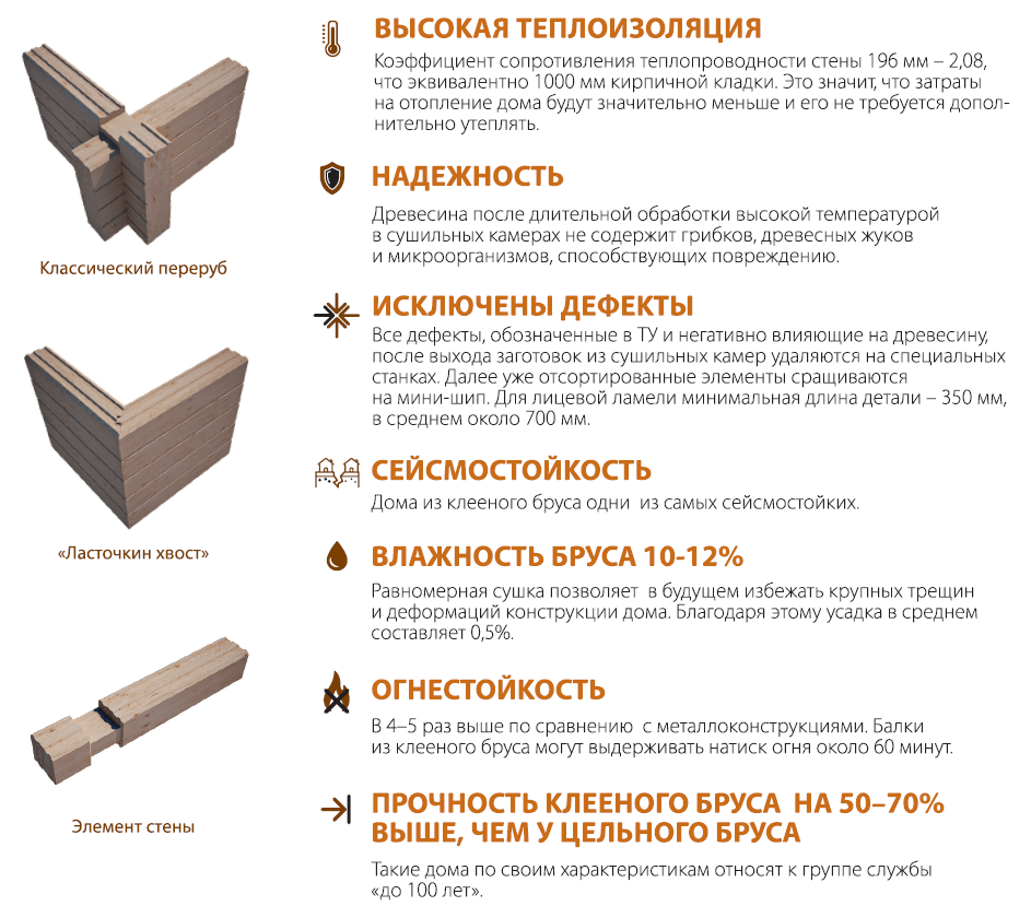 Кроме того, клееный брус, как говорится «дышит», тем самым он представляет более высокую ценность, чем какой — либо другой материал.