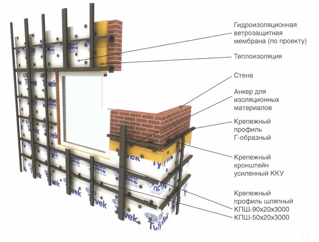 Навесной фасад представляет из себя конструкцию, состоящую из следующих элементов: