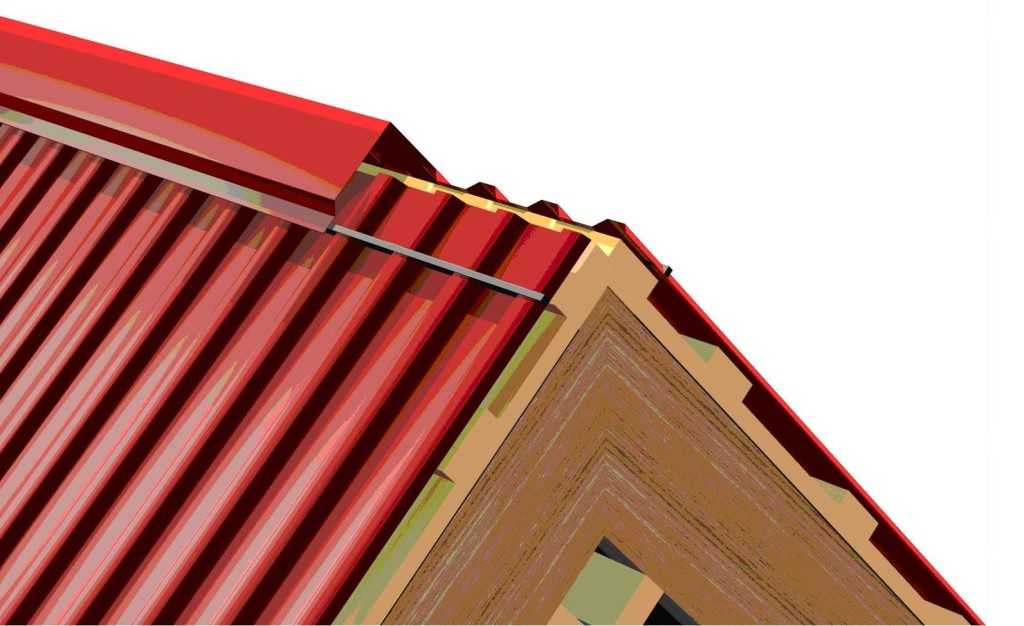 На конек крыши устанавливают специальные элементы, которые могут иметь разную форму. Выбирать форму коньковых элементов необходимо с учетом конструкции крыши. Крепятся такие элементы к уже уложенной металлочерепице, саморезы длиной 70 мм, вкручивают в самые высокие части профиля.
