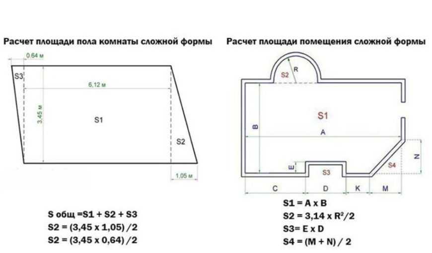 Высчитываются квадраты помещения, перемножим длину и ширину. Площадь круга – это радиус, помноженный на 3,14, полукруга – это значение круг, деленное на два.