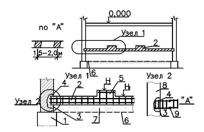 Усиление фундамента устройством монолитной плиты: 1 – существующий фундамент; 2 – плита усиления; 3 – штраба для заделки армокаркаса плиты; 4 – армокаркас заделки плиты в стену; 5 – ребра жесткости плиты; 6 – уровень разработки грунта для устройства плиты; 7 – щебеночная подготовка под плиту; 8 – несущая стена здания; 9 – электросварка армокаркасов плиты.