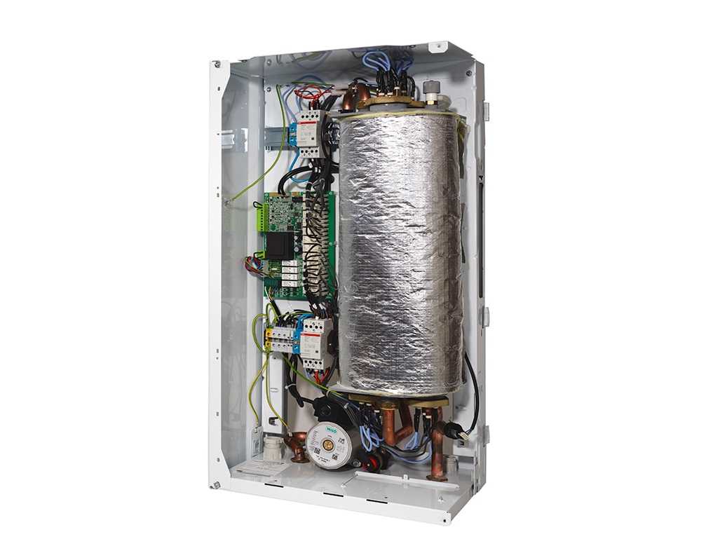 Режим питания — от сети с напряжением 380 В. Нагрев обеспечивают четыре блока ТЭНов по 6 кВт. Наибольшая площадь помещения для отопления составляет 240 квадратных метров. Оснащен дисплеем на передней панели, на который выводятся подробные данные о состоянии системы отопления и окружающей среды. Также котел оборудован чувствительной пошаговой настройкой мощности. Это позволяет не только выбрать подходящий температурный режим, но и обеспечить значительную экономию электроэнергии.