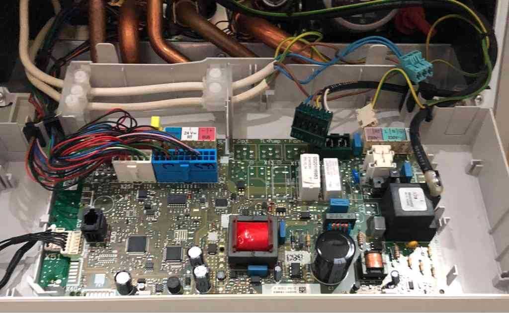 Речь идет как раз-таки о плате управления. Находится она на в нижней части конструкции, и чтобы добраться, придется повозиться с болтиками, в моем случае все выглядит хлипко. Наконец котел Валиант открыт и можно осмотреться. Плата управления представляет собой обычный элемент, такой же, как и в компьютере. При разборе газового котла рекомендуется лишний раз не трогать пальцами контакты, соединительные элементы, поскольку на них остаются жирные пятна. Все это может повлиять на работу автоматики.
