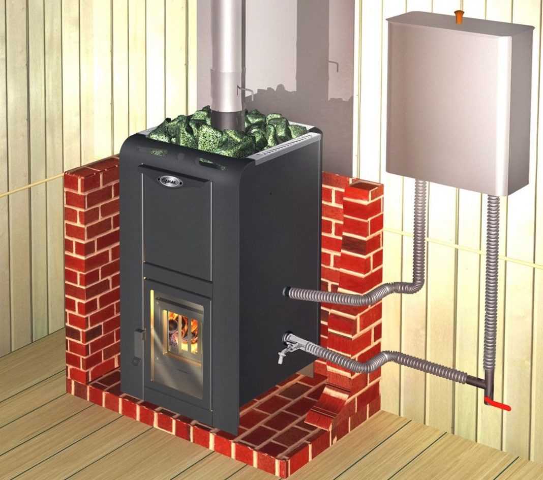 Размещая печь в парилке, обычно руководствуются потребностью в создании максимально комфортных условий для использования агрегата. Например, красивым и функциональным является решение, когда оборудование дополнительно обкладывают кирпичом, предусмотрительно обустроив выносной бак для воды. Длина топливника такова, что топочную дверцу можно внедрить в смежном помещении.