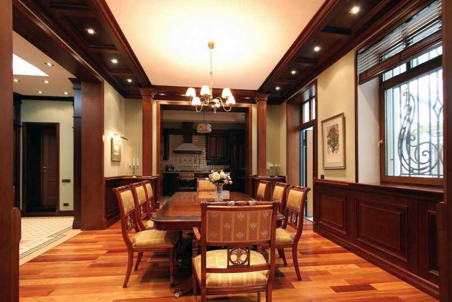 Дизайн интерьера внутри дома обязательно должен соответствовать той эпохе, в приемах которой было оформлено все здание. Особого внимания заслуживает гостиная, так как именно она является главной частью всего дома. Располагать ее необходимо в центре здания, под гостевое пространство отводится большое помещение, зачастую совмещенное со столовой и кухне.