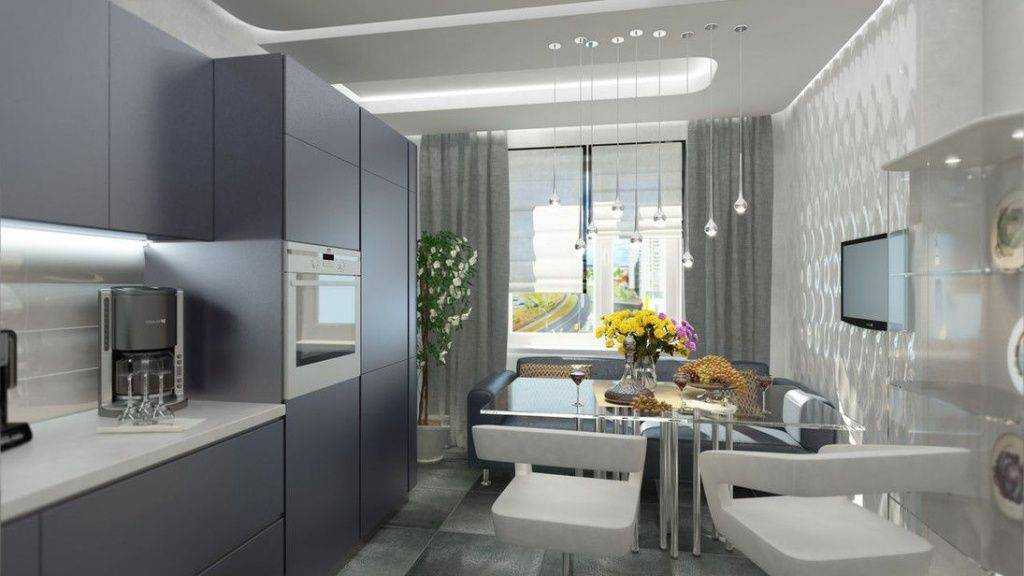 В первом варианте в одной большой комнате соединяются гостиная и кухня, большие панорамные окна дают ещё больший простор, узкое помещение становится визуально шире. Стены – белые, пол контрастный тёмный, как и мебель из дерева. Текстиль, мягкая мебель, освещение придают интерьеру уют.