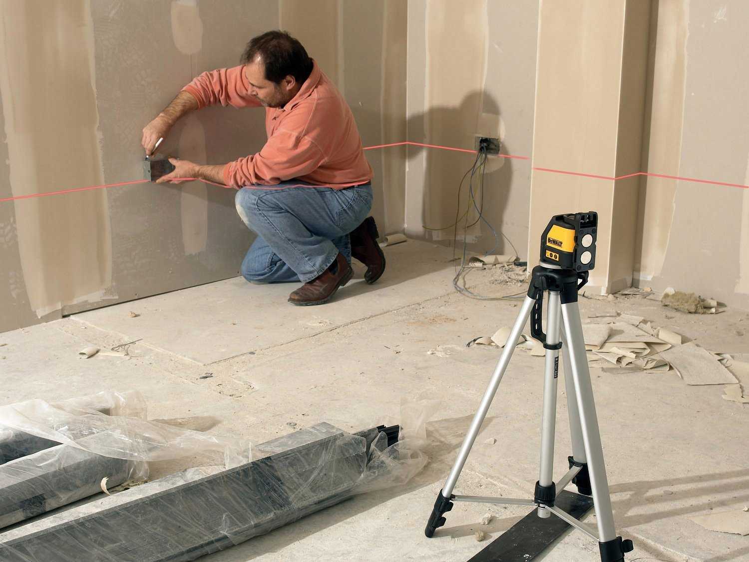 | Лазерный уровень | Дорогостоящее и очень эффективное измерительное оборудование для нанесения разметки и проверки перпендикулярности стен потолку. |