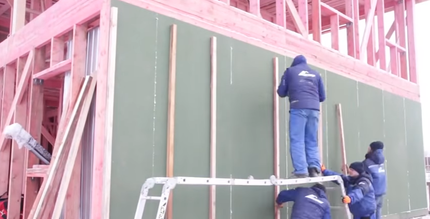 - Возведение каркасных домов. Различные строительные компании используют при этом ветрозащитные панели. Они могут устанавливаться как снаружи каркаса, так и внутри конструкции, обеспечивая еще большую тепло- и звукоизоляцию. Стоит отметить, что при установке на каркас, лист может изогнуться, особенно при высоком уровне влажности воздуха.