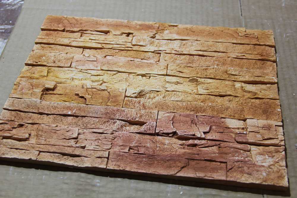 Искусственный камень из гипса обладает уникальными свойствами проявления оттенков, которые похожи на натуральные благодаря впитыванию подкрашенной воды.