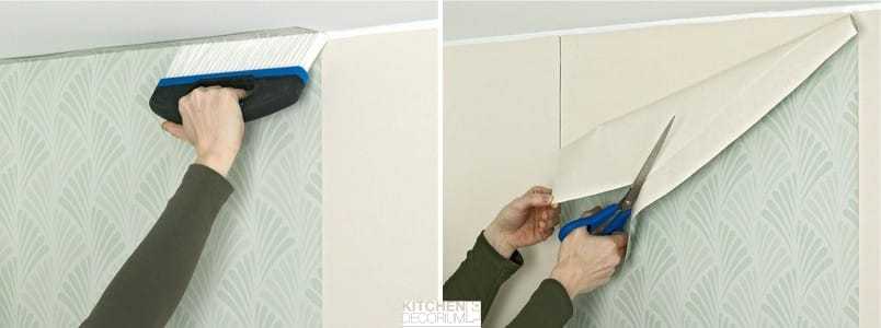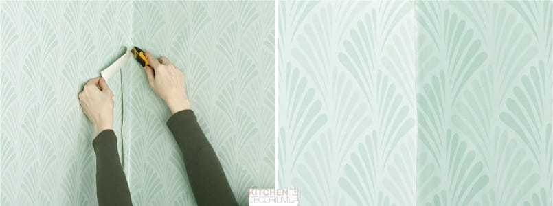 После приклеивания обоины прорежьте стык, уберите ненужную полоску.