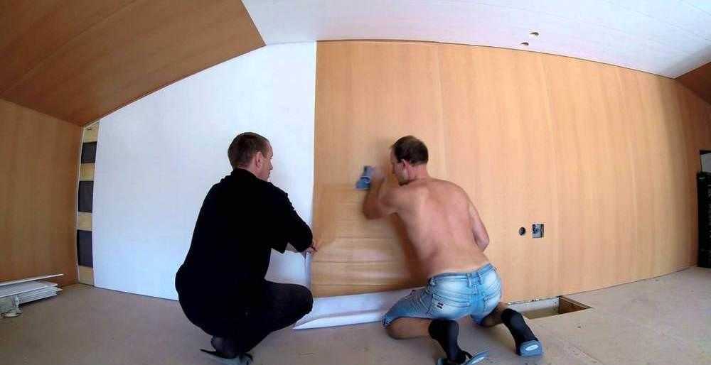При этом первоначально лучше это сделать, не больше чем на 15 см. Далее лист необходимо приложить к той стене, которую вы планируете клеить и как следует разровнять в соответствии с линией разметки.