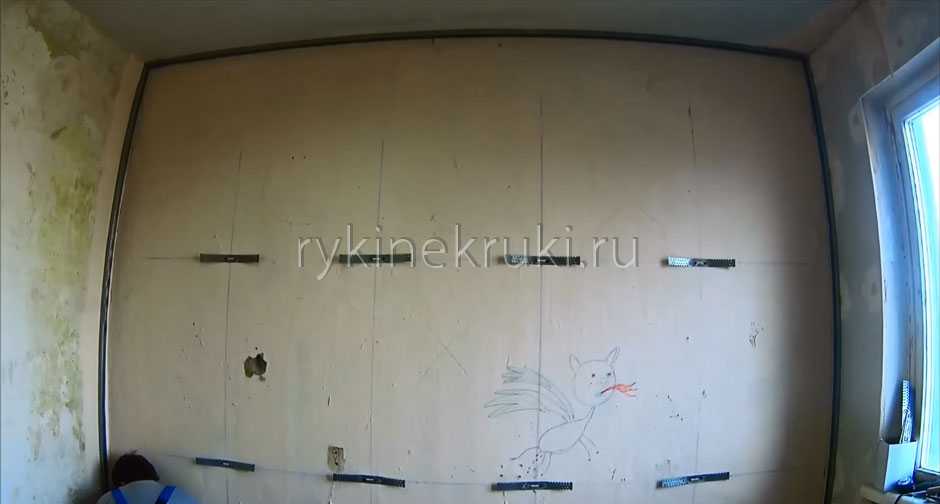 - Полосы надо закрепить горизонтально по всей длине стены на расстоянии 500-600 мм между ними, при помощи этого же клея или длинных саморезов в потай;