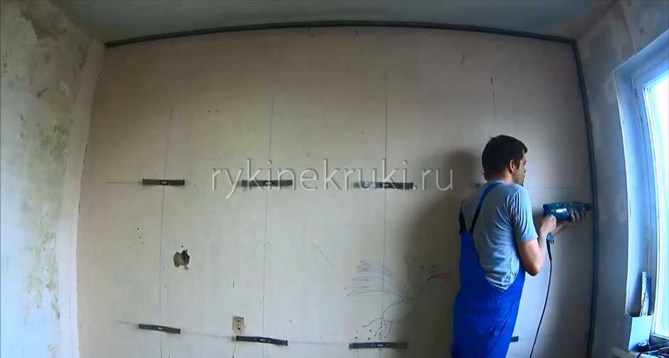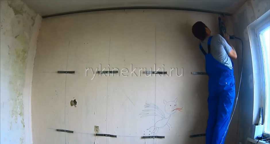 - Каждый лист гипрока закрепить к стене на небольшом относе (5-10 мм), прикрутив его в нескольких местах саморезами через дистанционные проставки или через широкие шайбы;