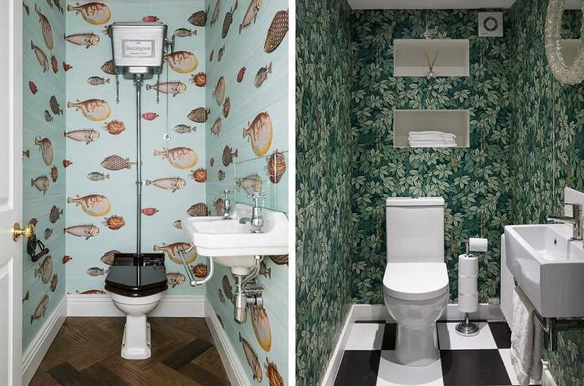 На фото слева туалет с разным типом отделки. Используется сочетание обоев с крупным растительным узором и плиткой.