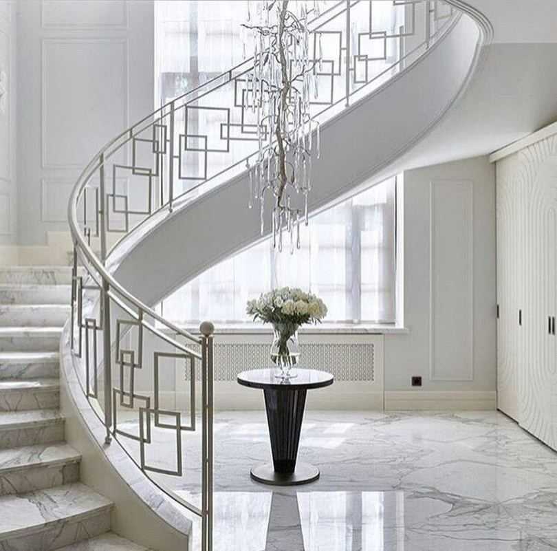 - Неоклассика. Неоклассический интерьер украсит мраморный пролет с коваными перилами. Ковка включает утонченные элементы с белой патиной и золочением, балясины конусообразной формы. Мрамор может быть как светлым, так и темным или цветным.