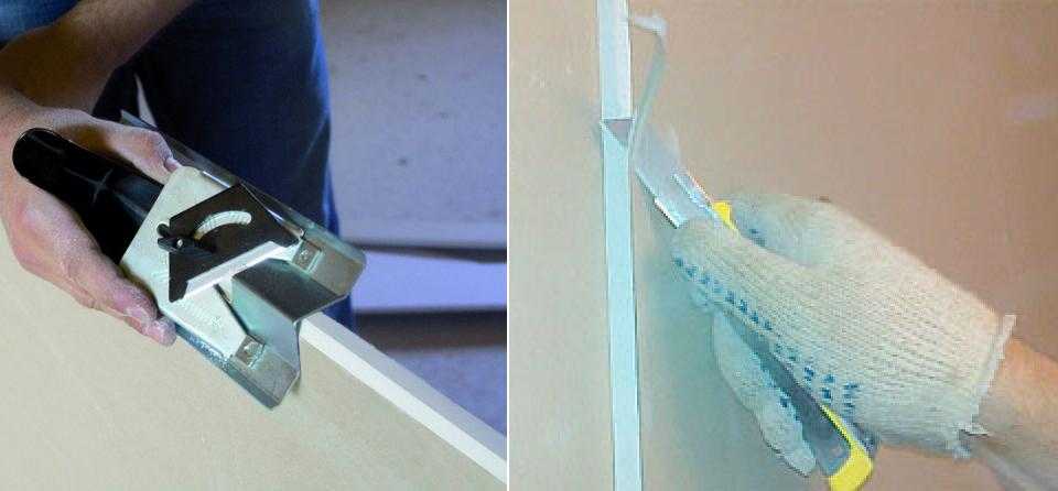 Стыки между плитами гипсокартона очищаются от грязи, пыли, в зазорах убирают строительный мусор. На обрезанных или заводских кромках с помощью строительного ножа выполняются углубления размером в 0,5 см с наклоном в 45°. Процедура необходима, чтобы повысить качество адгезии шпаклевочной смеси с гипсокартонными перекрытиями.