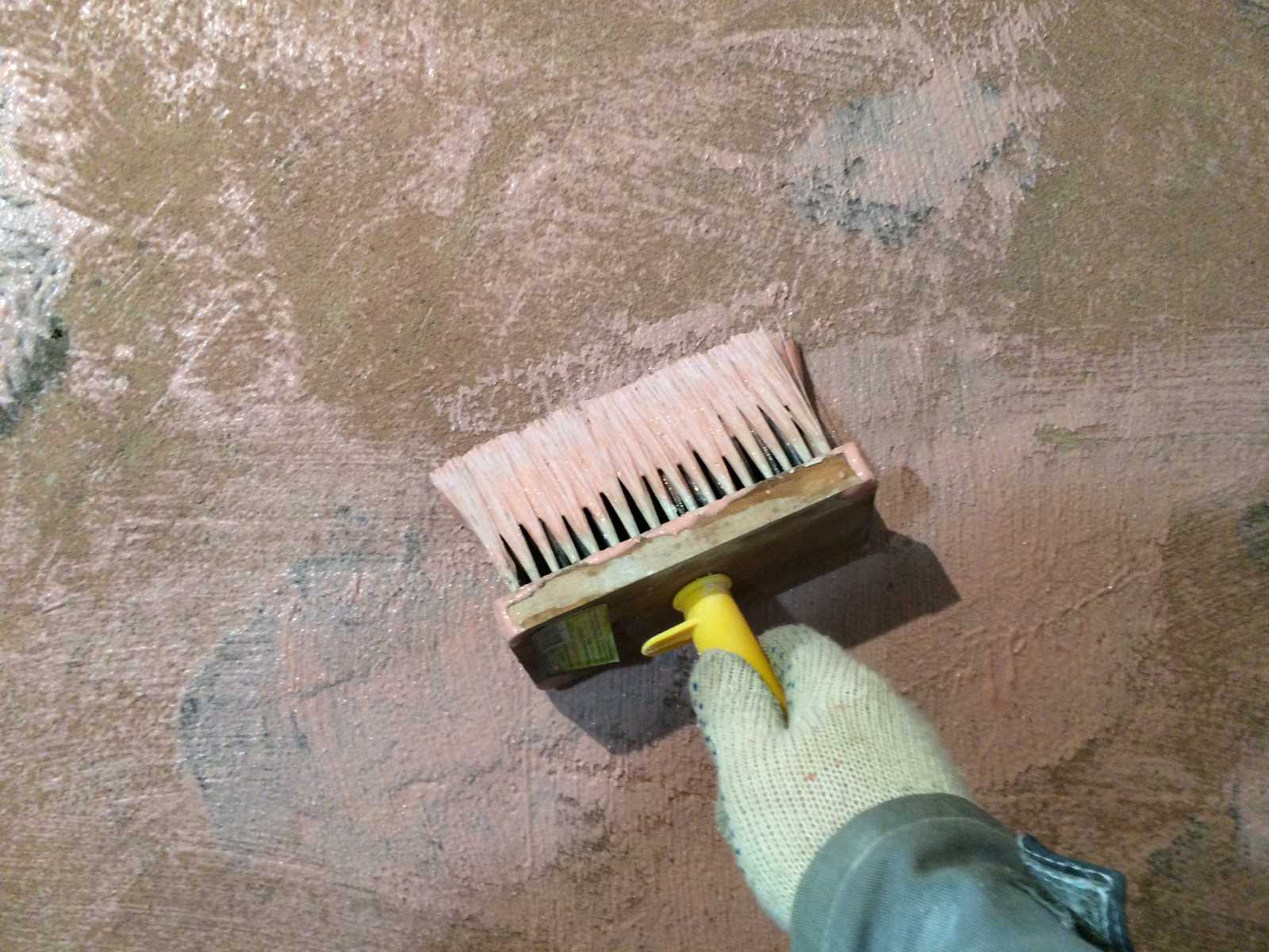 - кистью. Подходящий вариант, но требует тщательного втирания материала в поверхность и характеризуется длительностью работ и большими трудовыми затратами. В кисти часто засоряются частицы песка, что требует постоянного смачивания ее в растворителе — это может способствовать образованию разводов, которые потребуют дополнительного окрашивания;