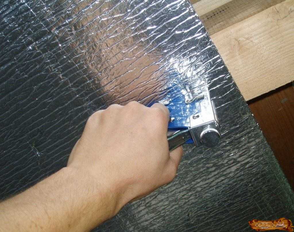 Покрытие укладывается и закрепляется скобами по всей поверхности стены без пробелов и зазоров. Повреждения следует заклеить алюминиевым скотчем. Также проклеиваются стыки утеплителя для достижения герметичности.