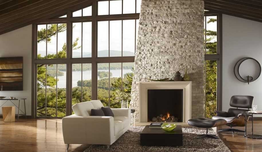 Для каминов важно, чтобы угольки не стали виновниками пожара в доме. На фото абсолютно обычный керамогранит, который полностью справляется с поставленной задачей