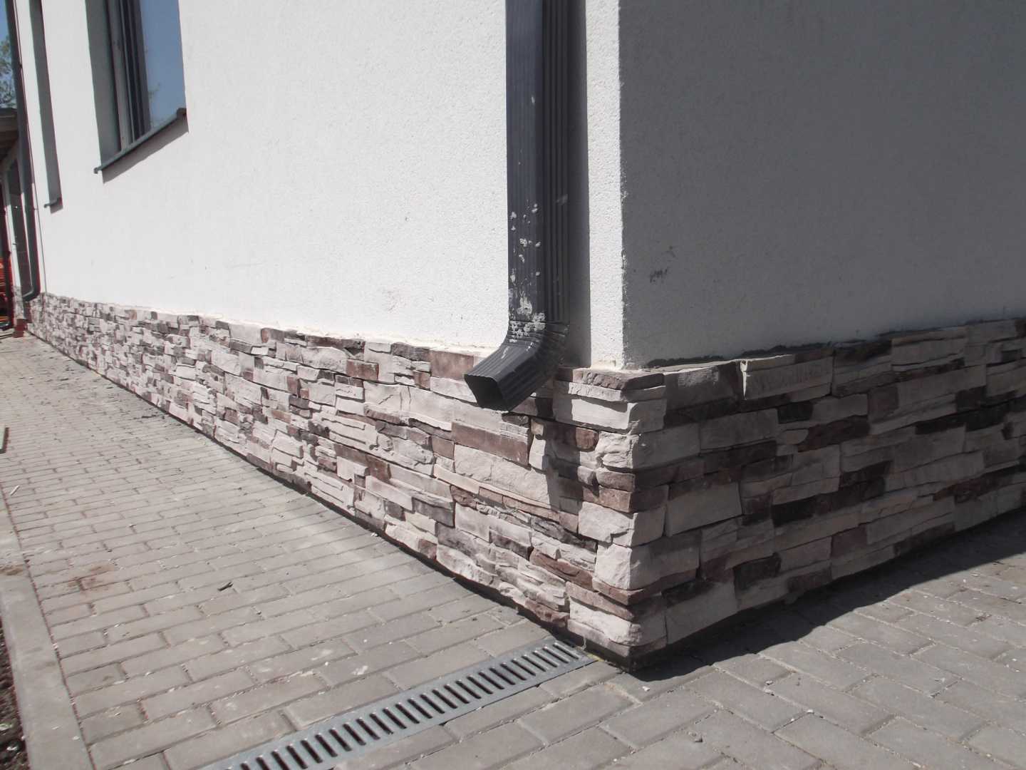 Искусственный камень имеет преимущества натурального материала. Дополнительное преимущество — доступная стоимость. Покрытие отличается небольшой толщиной и весом. Оно подходит, когда между фасадом и цокольным элементом не должно быть больших перепадов.
