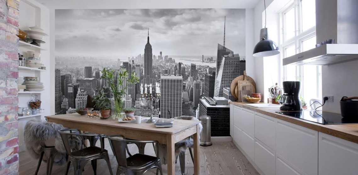 В новомодных интерьерах чаще используют городские пейзажи. Наиболее эффектно смотрится ночной мегаполис, но и черно-белые варианты бывают не хуже.