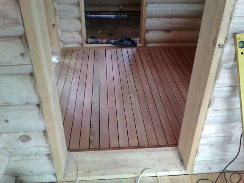 - Сначала в парной организуется деревянный настил. Он идет на 15 см выше настилов в остальных комнатах.