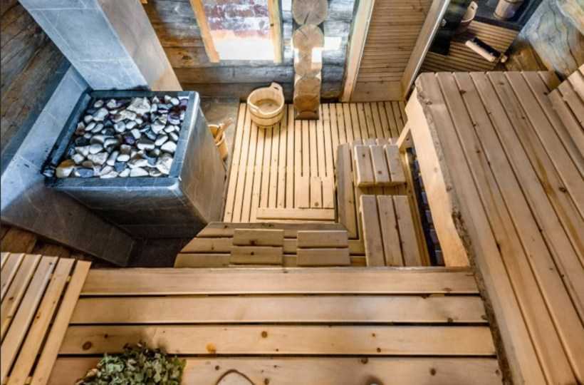 Слой в 15 сантиметров в процессе внутренней отделки бани из бревна между внутренним и внешним слоями обшивки гарантирует прекрасную теплоизоляцию