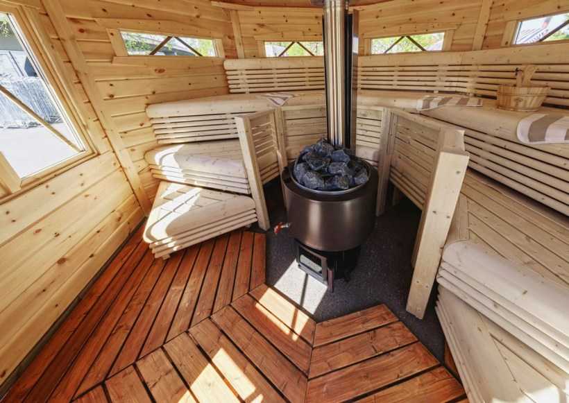 - Оригинальная парилка в бане с отделкой вагонкой из лиственных пород древесины. Занимательный элемент – круглое окно с видом на озеро.