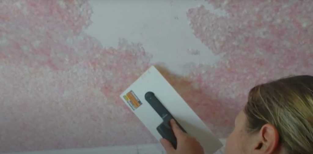 Локальный ремонт жидких обоев на потолке, как правило, заключается в приглаживании имеющегося покрытия. Чтобы оно размокло, его обильно смачивают водой, поддерживая набухание в течение 20 – 30 минут. Даже лак, скорее всего, пропустит такое воздействие. Когда участок достаточно промокнет, его нужно просто загладить шпателем, повторяя движения под разными углами, в различных направлениях.