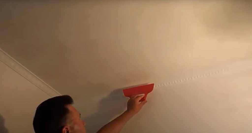 - До тех пор, пока не началась полимеризация состава, следует произвести контроль поверхности с помощью яркой лампы накаливания. Если на потолке обнаруживаются ямы или наплывы, следует выровнять этот участок с помощью большой разглаживающей тёрки.