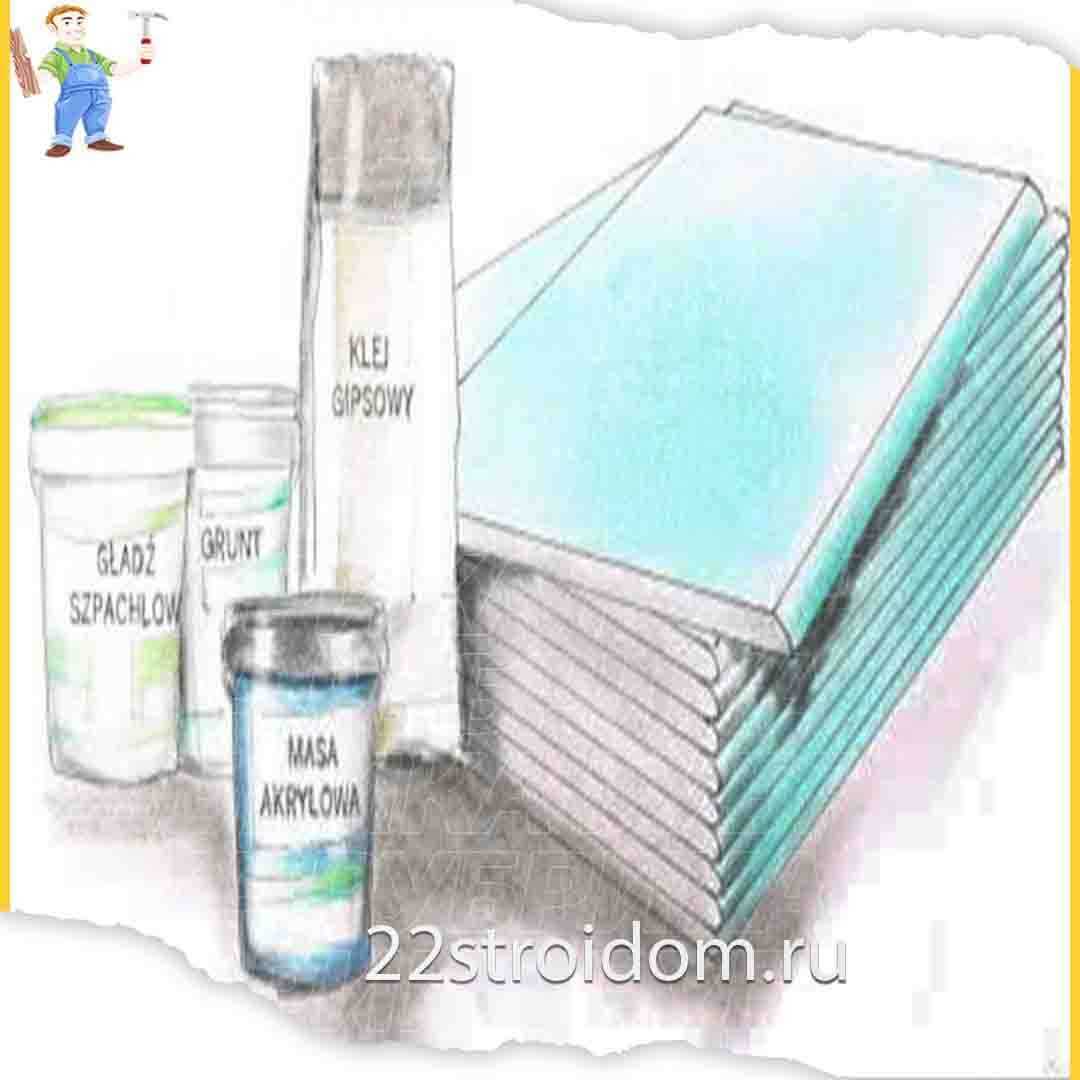 Вторая серьезная покупка — это гипсовый клей. Его количество можно оценить, исходя из того, что для наклеивания 3-х досок потребуется 25 кг клея. Дополнительно вам понадобятся — гипсовая шпаклевка и финишное покрытие, ленты для усиления стыков панелей и внутренних углов, алюминиевые кромочные профили для защиты внешних углов. Также пригодятся акриловая масса, грунтовка и распорные штифты.