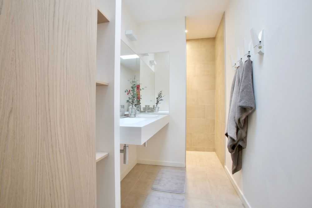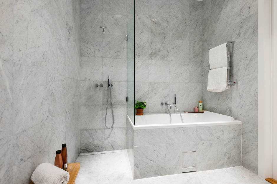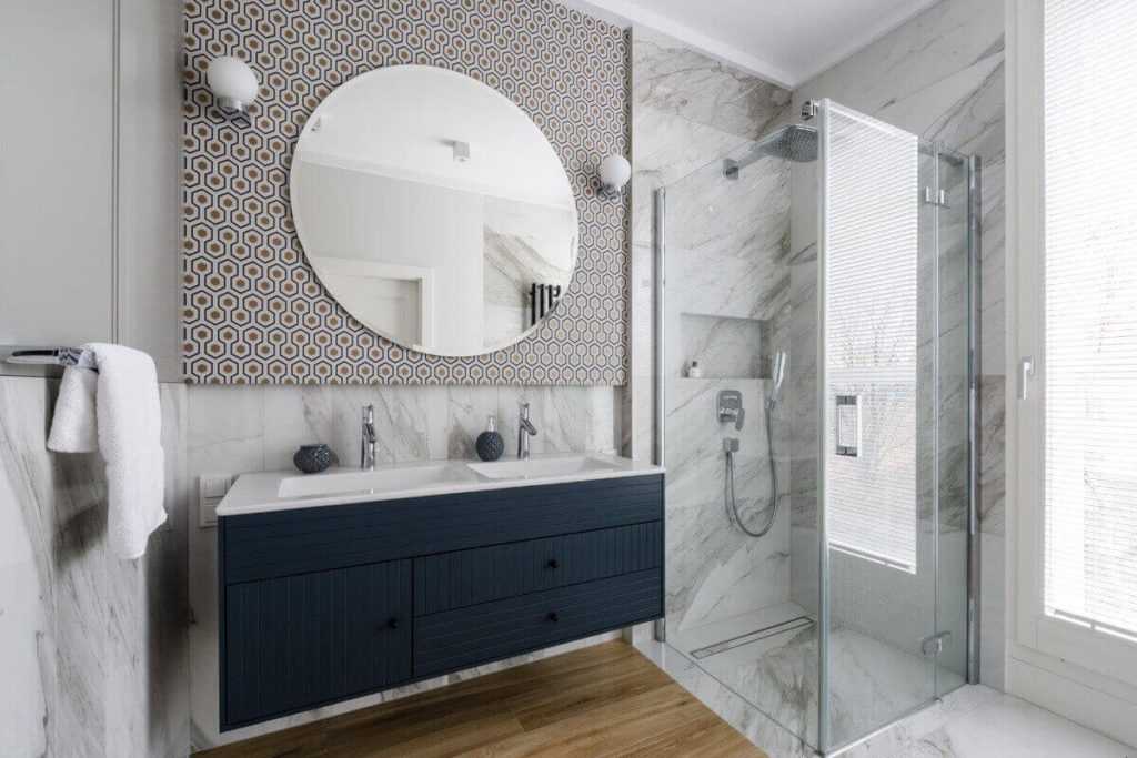 Если в ванной комнате нет кабины или душ находится за стеной, высота плитки может быть определена раковиной. Такие плитки будут своего рода высокими панелями, достигая почти 120 см. Если цвет материала и стен над ним контрастный, стоит знать, что горизонтальное деление поверхности, опускающееся чуть ниже половины высоты, визуально поднимет интерьер, а чуть выше понизит его.