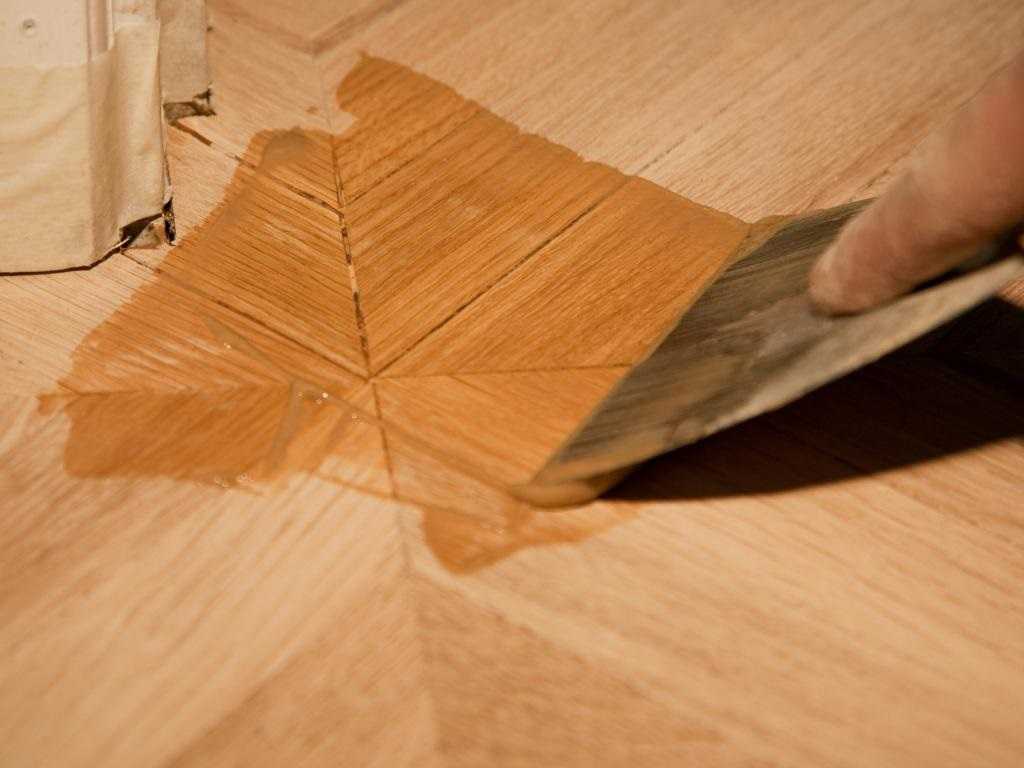 Нанесение шпаклевки шпателем при укладке паркета