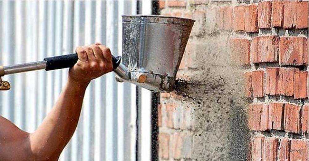 Один из самых простых способов наложения штукатурки на поверхность — использование палки и веника