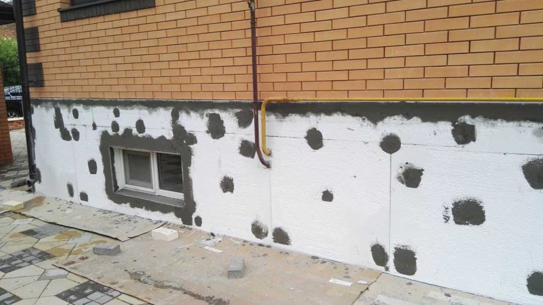 Технология работ заключается в приклеивании полистирола к гидроизолированной поверхности фундамента и последующей дополнительной фиксации тарельчатыми дюбелями.