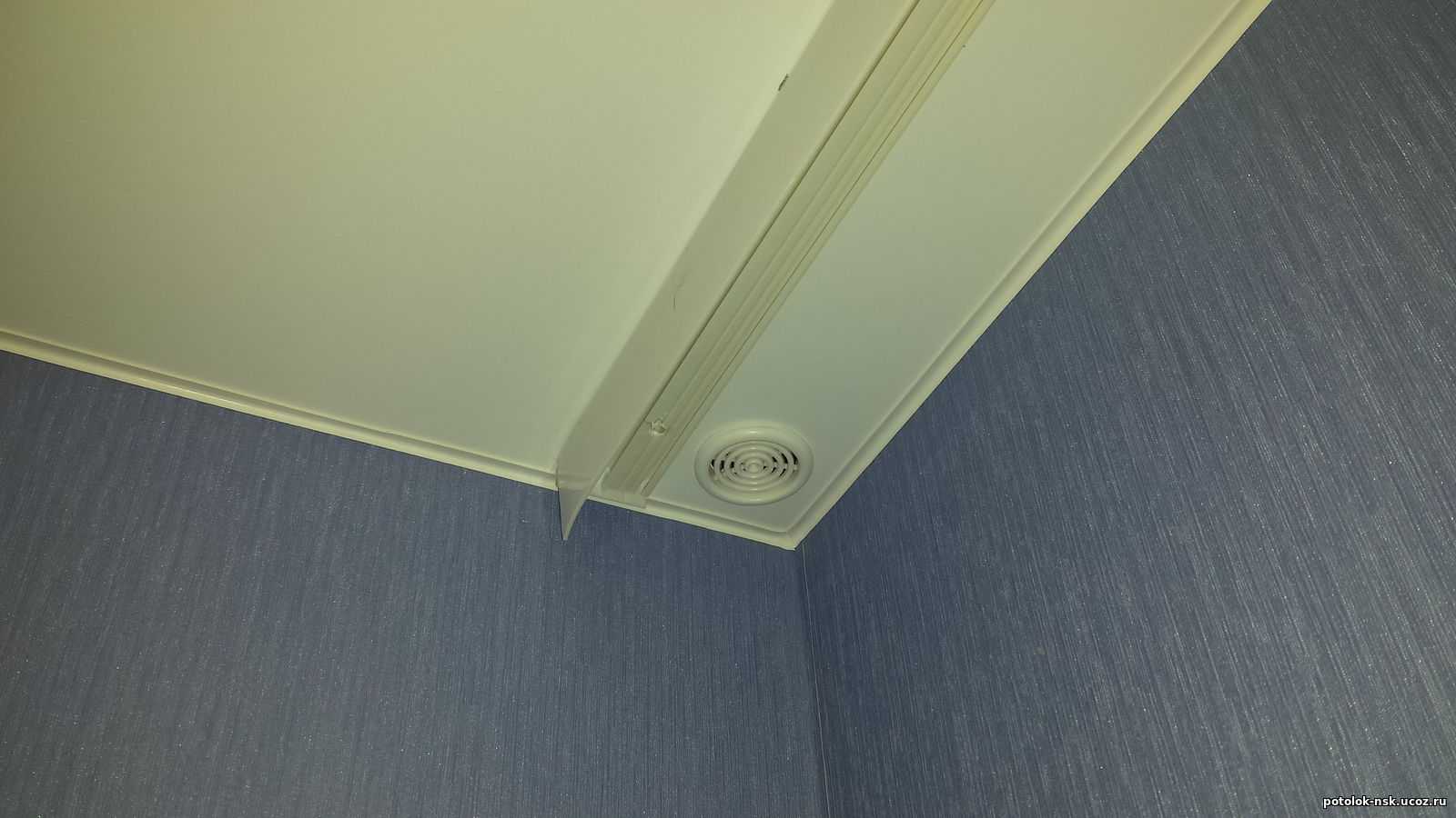 - Если натяжной потолок провисает от воздуха, оптимальным вариантом решения проблемы станет заделывание щелей на стыках стен и перекрытия. Пленку демонтируют, после чего выполняют поиск трещин. Найденные щели заделывают герметичными материалами (строительная пена, цементный раствор и пр.) и дают высохнуть. Во время монтажа пленки рекомендуется установить небольшую вентиляционную решетку (или несколько), обеспечивающую циркуляцию воздуха в межпотолочном пространстве. В продаже есть компактные модели, которые можно разместить по углам натяжного потолка или спрятать за гардинами.