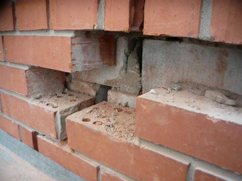- Аккуратно разберите кирпичную кладку по всей трещине (скорей всего, осколки кирпича будут легко выниматься);
