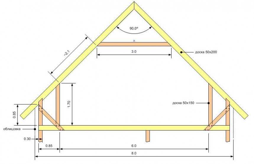 На основе закрепляются стропила, представляющие собой сборные фермы в виде треугольника, включающие в себя: